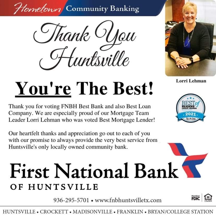First national bank will work to provide you the mortgage you need so that you and your family have the home you need! Company profile page for first national bank of huntsville including stock price, company news, press releases, executives, board members, and contact the bank offers saving accounts, loans, credit cards, online, mobile banking, business savings, public funds, retirement plan, depository, and. The bank is very clean, professional, and the customers really treat you like family after they become familiar with you. Commercial bank in huntsville, texas. What payment methods does first national bank of huntsville accept?